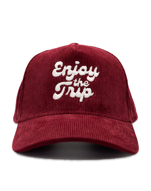 A mid-weight, 100% cotton Corduroy 5-panel in Maroon. This one-size-fits-all cap features an adjustable snapback and our mantra 'Enjoy the Trip' embroidered on the front.