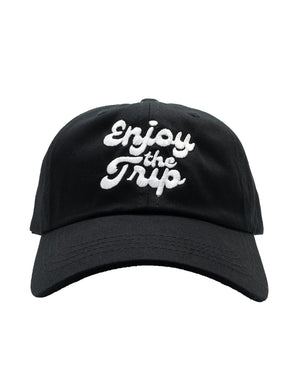 An unstructured, 100% cotton classic Dad Hat in Black. This one-size-fits-all cap features an adjustable fastener with a brass clasp and our mantra 'Enjoy the Trip' embroidered on the front.