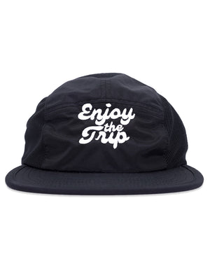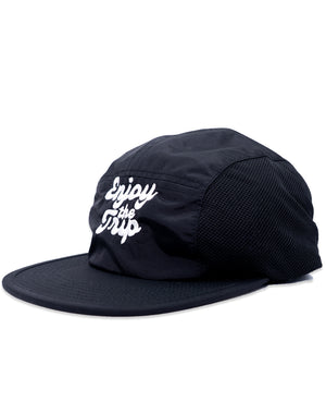 A low-profile, 5-panel, performance cap. This one-size-fits-all cap features an adjustable plastic fastener for a perfect, secure fit even while in rapid motion. Designed to be lightweight with a quick drying fabric and mesh side panels to keep your head cool. Features our trademark 'Enjoy the Trip' design embroidered on the front. The perfect activewear running cap.