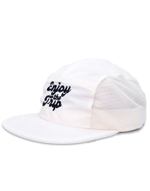 A low-profile, 5-panel, performance cap. This one-size-fits-all cap features an adjustable plastic fastener for a perfect, secure fit even while in rapid motion. Designed to be lightweight with a quick drying fabric and mesh side panels to keep your head cool. Features our trademark 'Enjoy the Trip' design embroidered on the front. The perfect activewear running cap.