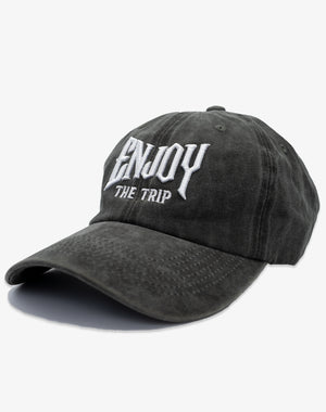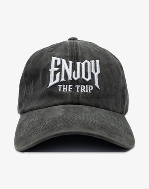 A light-weight, 100% cotton cap in a washed Charcoal color. This one-size-fits-all cap features an adjustable fastener with a metal clasp and the stylized 'Enjoy the Trip' Rock Band design embroidered on the front.